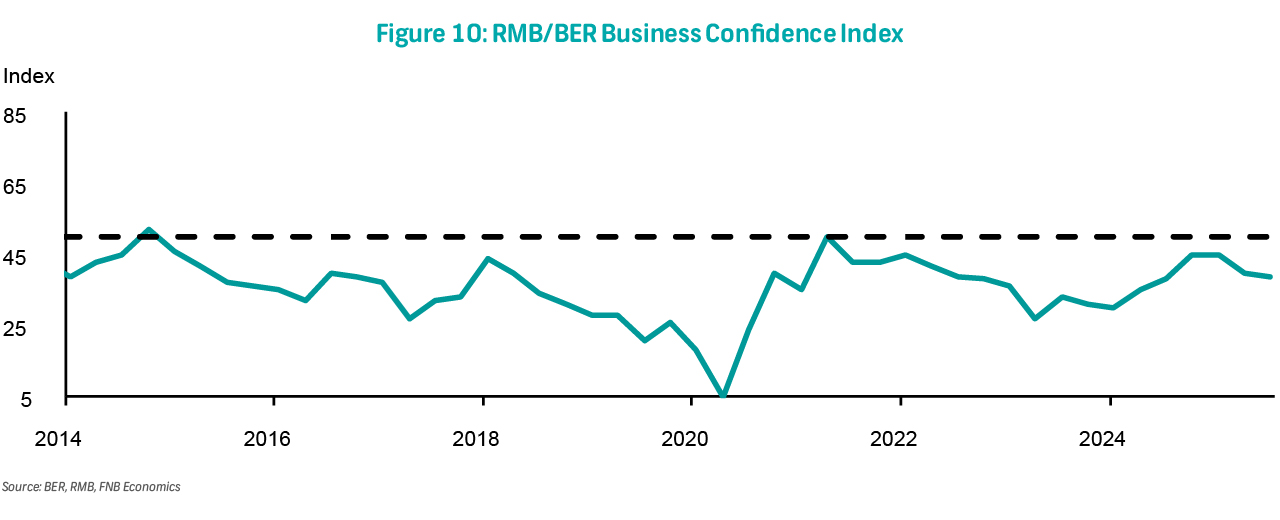 On Wednesday, the RMB/BER Business Confidence Index (BCI) for 4Q25 will be published. In 3Q25, the BCI edge down to 39 points, falling below its long-term average of 42, signalling widespread dissatisfaction among businesses. Although the composite index appeared largely flat, this masked substantial sector-level shifts, with confidence in each sector moving by ten points or more, well beyond typical volatility. The survey results indicate that the economy continues to muddle through, with confidence levels too low to catalyse the investment needed to lift South Africa's growth and employment trajectory.