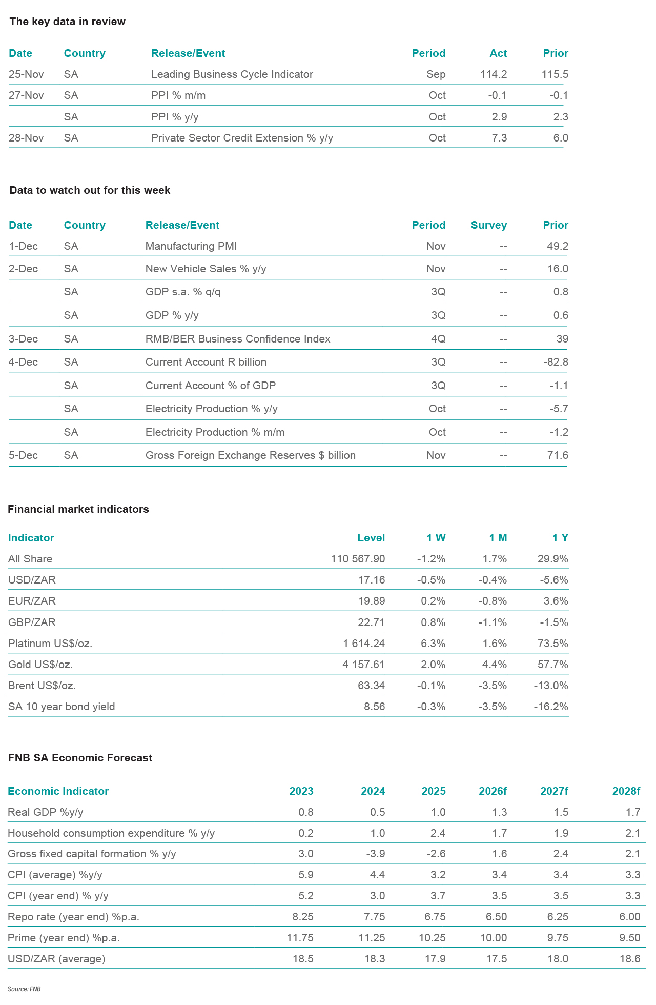 On Tuesday, the 3Q25 Gross Domestic Product (GDP) data will be released. Real GDP grew by 0.6% y/y in 2Q25, following gains of 0.8% y/y in both 1Q25 and 4Q24. On a seasonally adjusted basis, the economy expanded by 0.8% q/q. Growth was broad-based, with mining, manufacturing, and trade each contributing 0.2ppts, while finance, government, personal services, and agriculture each added 0.1ppt. Household consumption rose 0.8% q/q, total investments rebounded on inventory restocking despite weaker fixed investment, and net exports detracted from growth as exports fell more than imports. We expect quarterly GDP growth to have been maintained, albeit at around 0.2%, underpinned by the broader trade sector, alongside the mining, transport and finance sectors. The notoriously volatile agricultural sector presents risks on either side of the forecast.