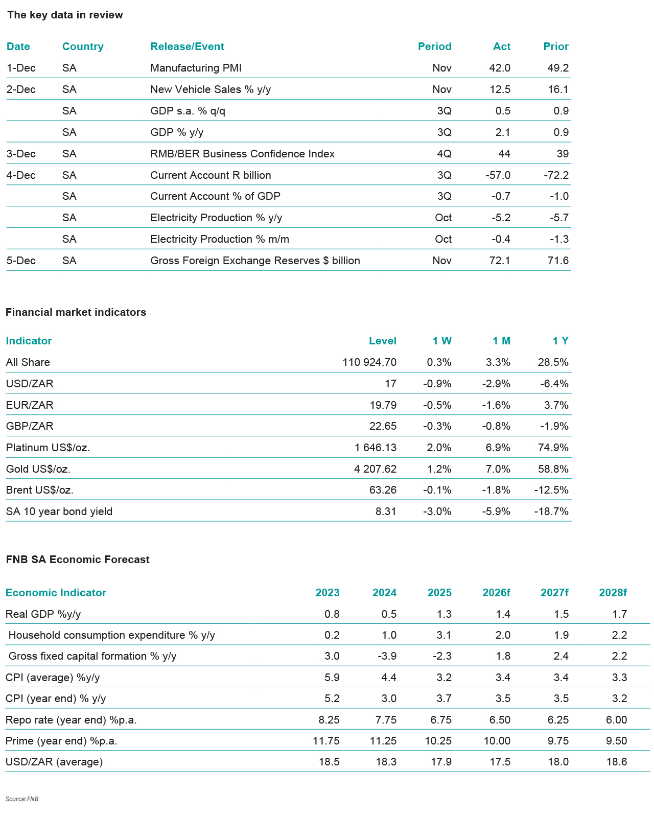 The Manufacturing PMI fell by 1.6 points to 49.2 points in October, continuing into contractionary territory. The outcome was driven by declines in four of the five headline PMI subcomponents, with employment being the only area showing slight improvement. Business activity saw a further drop, from 49.4 points in October to 36.7 in November. Even though the index has shown volatility, its sustained weakness is evident in the continued lack of momentum in official manufacturing data. Although a major drag on the headline PMI, the sharp drop in the supplier deliveries index could signal positive news if shorter delivery times reflect easing logistical constraints. The new sales orders index fell from 48.9 points in October to 35.6 in November. Export sales remained subdued, but the renewed decline in demand was primarily driven by the domestic economy. The employment index increased from 45.1 points in October to 46.2 in November. However, demand continues to be muted as activity remains volatile. More positively, the index tracking expected business conditions edged up to 50.8, signalling anticipated improvement in business conditions over the next six months.