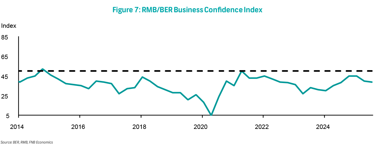 The RMB/BER Confidence Index (BCI) rose to 44 index points in 4Q25, up from 39 previously. While the composite index showed a positive shift, this again masked pronounced sector-level movements. Retail and manufacturing sectors saw the largest improvements in confidence, while building contractors experienced a fall. New vehicle dealers experienced further gains supported by interest rate cuts and resilient demand in budget-friendly segments. The survey period followed the South African Reserve Bank's rate cut and its shift toward a lower inflation target, which provided some relief to businesses. However, the lingering effects of earlier export tariffs and subdued global growth continued to weigh on the outlook, particularly for sectors exposed to international markets.
