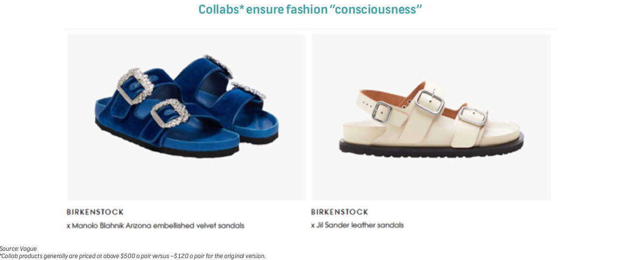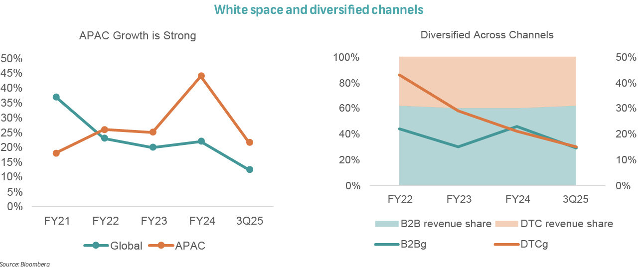 Its engineered distribution approach plays into the strategic scarcity model and strategically balances a growing direct-to-consumer (DTC) presence with carefully selected wholesale partnerships (B2B), optimising both profitability and brand control. Rather than overextending its presence, Birkenstock prioritises brand integrity and long-term equity, deliberately avoiding overexposure in discount-driven or lower-tier retail environments. In the US, as an example, the company enjoys ~90% full price realisation - meaning that margin integrity is preserved. Geographically, the company is focused on capturing "whitespace" in underpenetrated markets, particularly where brand awareness is high, but access remains limited. By targeting these areas of latent demand, Birkenstock aims to deepen its global footprint while maintaining its premium positioning.