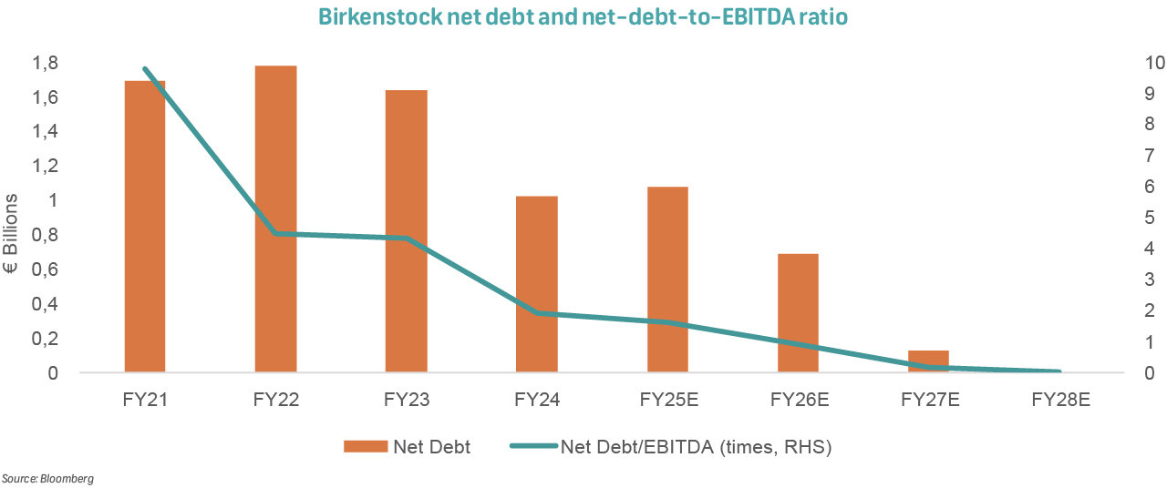 Additional support is anticipated to come from meaningfully lower net finance costs as a result of substantially lower debt levels. Birkenstock was spun out of a private equity environment with a heavily geared balance sheet. The company is highly cash generative, however, with comparatively low levels of capital expenditure planned, and it is expected that it could be debt free by FY28.