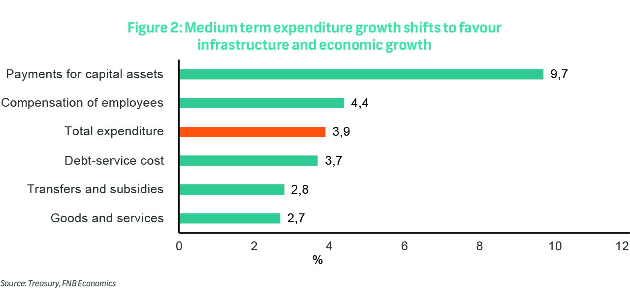 Reforms are underway to mobilise private investment and expertise and accelerate public-sector delivery, to improve operating conditions. Government's own capital spending over the medium-term expenditure framework (MTEF) is expected to grow by 9.7% per year, equating to robust real capital growth. This is significantly higher than the 4.4% annual growth for compensation of employees. For the first time in the current decade, the fiscal framework reflects debt-service costs growing more slowly than overall expenditure growth of 3.9% (Figure 2).