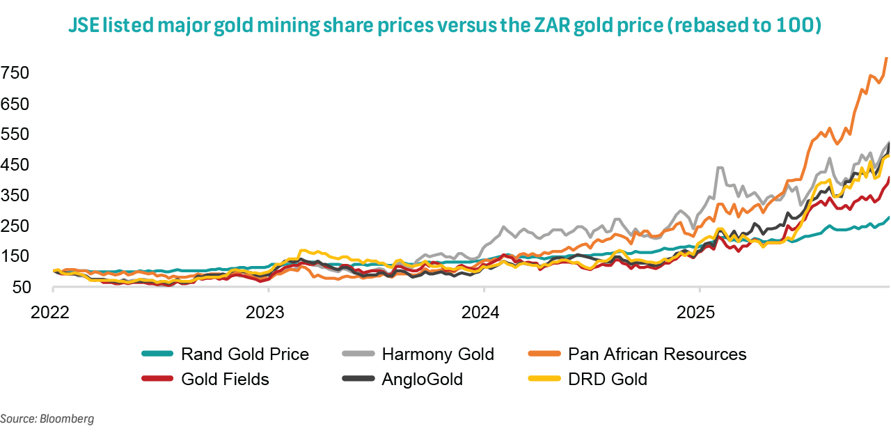 • Gold mining companies on the JSE: Investors can also gain exposure to the gold price by buying listed gold mining companies. This comes with the added complexities attached to mining, including costs and operational execution. Since the start of the current gold bull run, around the time of the invasion of Ukraine, most listed gold miners have now delivered return performances ahead of the rand gold price. This is because these companies are generating supernormal cash flows at current gold prices, but it may be a risky play due to the sharp outperformance more recently and their high volatility relative to the (already at times volatile) gold price.