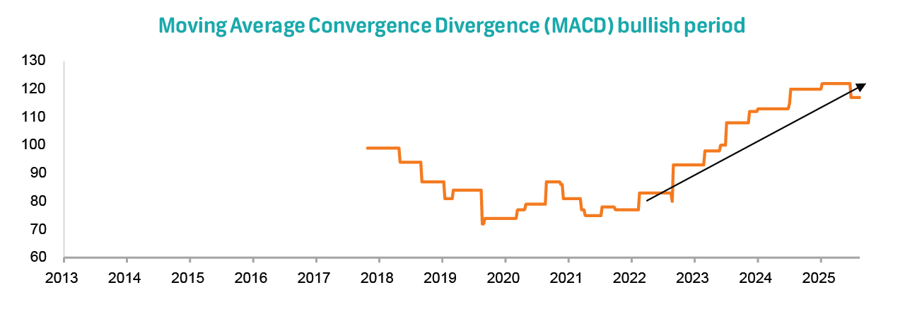 Based on its historical tendency for strong follow-through after recovery phases and an improving return profile, upside potential into 2026 remains favourable. The price is holding above its 200-day simple moving average. The profit target remains R110.00, with a trailing stop-loss at R97.60. |